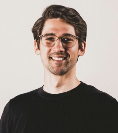 A person is holding a resume in front of them while sitting at a white table. Another person, slightly blurred, is seated across the table. The resume has a blue header with the name and title 'Lauren Chen, Digital Marketing Specialist'. Sections visible include contact information, education, and professional experience.